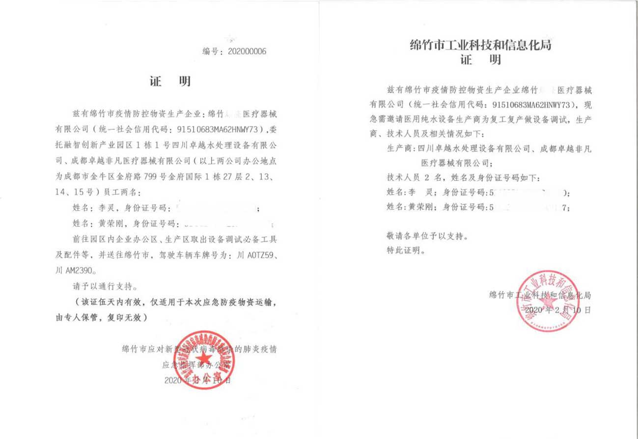 疫情就是命令,防控就是責(zé)任。卓越公司應(yīng)邀前往四川省綿竹市,為綿竹市疫情防控物資生產(chǎn)企業(yè)調(diào)試必備工具和配件等。在收到相關(guān)證明手續(xù)后,公司安排兩位經(jīng)驗(yàn)豐富的員工于2020年2月10日前往綿竹市。在抗?fàn)幰咔榈年P(guān)鍵時(shí)刻,肩負(fù)社會(huì)責(zé)任,爭做逆行者。