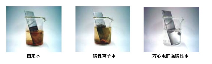將SPCC板分別浸泡在裝有自來水、堿性離子水、和PH值為11.7的強(qiáng)電解堿性水的燒瓶中,室溫下放置8天觀察,浸泡在自來水中的SPCC板只過了2個(gè)小時(shí)即已開始生銹,而浸泡在碳酸鉀堿性電解水中的SPCC板經(jīng)過了8天也未生銹。
