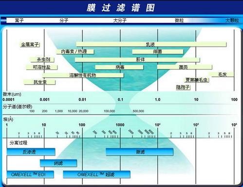 分離膜是具有選擇性分離功能的材料,利用膜的選擇性分離實(shí)現(xiàn)料液的不同組分的分離、純化、濃縮的過(guò)程稱(chēng)作膜分離。它與傳統(tǒng)過(guò)濾的不同在于,膜可以在分子范圍內(nèi)進(jìn)行分離,并且這過(guò)程是一種物理過(guò)程,不需發(fā)生相的變化和添加助劑。膜的孔徑一般為微米級(jí),依據(jù)其孔徑的不同(或稱(chēng)為截留分子量),可將膜分為微濾膜、超濾膜、納濾膜和反滲透膜,根據(jù)材料的不同,可分為無(wú)機(jī)膜和有機(jī)膜,無(wú)機(jī)膜主要是陶瓷膜和金屬膜,其過(guò)濾精度較低,選擇性較小。有機(jī)膜是由高分子材料做成的,如醋酸纖維素、芳香族聚酰胺、聚醚砜、聚氟聚合物等等。錯(cuò)流膜工藝中各種膜的分離與截留性能以膜的孔徑和截留分子量來(lái)加以區(qū)別,下圖簡(jiǎn)單示意了四種不同的膜分離過(guò)程:(箭頭反射表示該物質(zhì)無(wú)法透過(guò)膜而被截留):