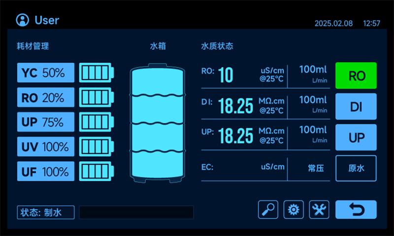 ★全自動微電腦控制,7寸彩色觸摸屏人機(jī)操作界面(尺寸1540*85mm),動畫顯示工作模式,中英文雙語言自由切換,圖示化顯示耗材壽命、儲水狀態(tài)、水質(zhì)狀態(tài)等運行參數(shù),可選配物聯(lián)網(wǎng)(LOT)和云端遠(yuǎn)程管理平臺,實現(xiàn)遠(yuǎn)程診斷、監(jiān)控、日常操作及儀器和云端雙備份運行數(shù)據(jù)信息。